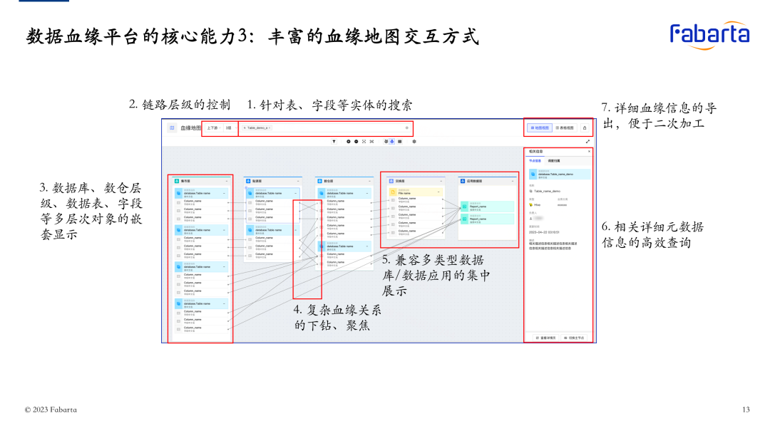 - 复杂血缘关系的下钻、聚焦:为了更好地查看血缘关系的实质信息,交互方式应提供高亮显示、聚焦和下钻功能。这样用户能够方便地查看和分析血缘关系的详细内容。
