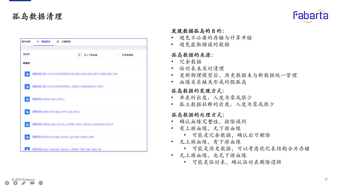 孤岛数据处理是血缘关系分析的一个常见应用场景。当一个数据没有上游或下游的血缘关系,或者上下游的血缘关系都不存在时,我们可以将其识别为孤岛数据,并进行清理。清理孤岛数据有两个目的:一是避免不必要的存储和计算开销,二是防止错误数据的使用。如果孤岛数据一直存在而被错误使用,将带来潜在的问题。