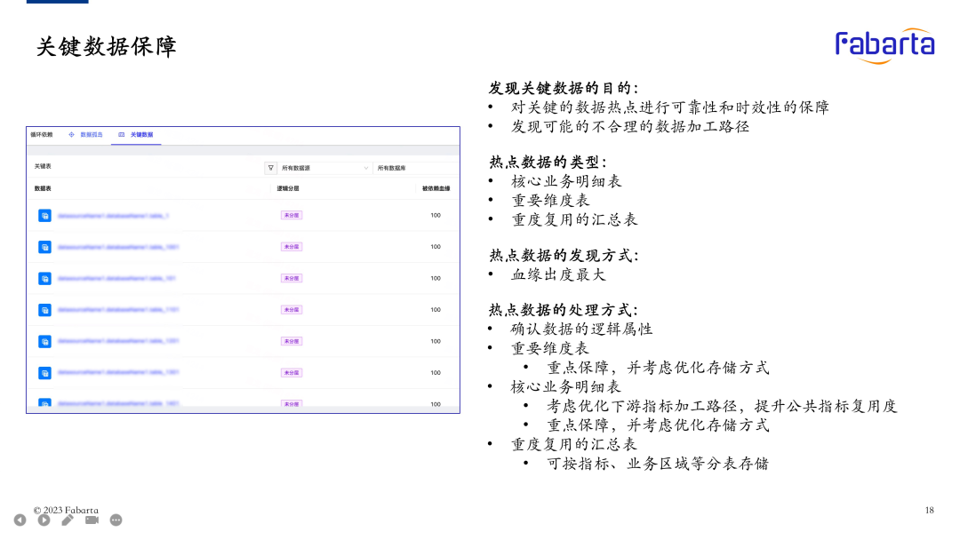 通过血缘关系分析,我们可以发现这些孤岛数据。一种典型的血缘关系应用是针对单表的入度和出度为零或极少的情况,将其判定为孤岛数据。这可以帮助我们识别孤岛数据的存在。另外,对于非单表数据,可以通过血缘关系的加工和分析来聚类数据,并发现某些数据与其他数据的关系非常有限或根本不存在,从而将其判定为孤岛数据。发现孤岛数据的过程中,我们也可以了解到一些导致孤岛数据产生的常见情况。首先是数据冗余,即复制了一份数据,但实际上只有原始数据或复制数据被广泛使用。这种情况下,复制的数据就成为了孤岛数据。其次是临时数据,它在产生的时刻可能有用,但只是一次性使用,之后就没有更多的用途了,这样的数据也会变成孤岛数据。另一种情况是历史数据与新版本数据存在差异,两者没有统一起来,导致历史数据成为孤岛数据的可能性增加。还有一种可能是血缘关系缺失,形成了一种假孤岛情况。对于不同可能性的孤岛数据,我们可以采取各种策略进行进一步处理。例如,如果只有上游血缘关系而没有下游血缘关系,那可能是冗余数据,确认后可以将其删除。如果只有下游血缘关系而没有上游血缘关系,很可能是历史数据,可以考虑优化表结构并与新版本数据进行合并存储。如果既没有上游血缘关系也没有下游血缘关系,那可能是临时表,可以进行清理操作。以上基于血缘信息识别孤岛数据,并根据不同情况采取不同策略的方法,是一种实际应用的方式。2.关键数据保障