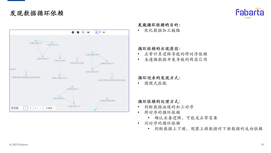 为了发现这种重度复用的汇总表,可以从热点数据的血缘关系中进行观察。对于不同类型的热点数据,可以采取不同的处理方式。例如,对于重要的维度表,我们应重点保障其稳定性,并可能优化存储方式以提高访问性能。对于热门的明细表,可以考虑提取公共指标,以简化数据加工复杂度,并让其频繁被读取。如果无法提取公共指标,仍需重点保障其稳定性。如果存在重度复用的汇率总表,可以考虑按照不同的指标或业务维度进行拆分,并进行分表存储。这样做可以简化其他方面的数据治理复杂度。如果所有指标都存在于同一张汇总表中,那么数据质量的监控会面临困难。同样,数据安全的分类和分级也会变得复杂。因此,尽可能进行分表存储是明智的选择。3.发现数据循环依赖