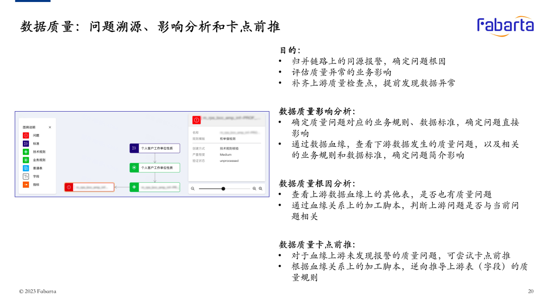 还存在一个关键的场景,即我们需要追溯数据质量问题的根源。当我们发现数据质量问题时,我们需要准确确定其对业务产生的影响。这个过程不仅仅涉及表与表、字段与字段之间的关系,更加关乎业务规则和数据质量问题之间的紧密关联。通过建立这种关联,我们能够清楚地了解质量问题的影响范围,以及它违反了哪些监管要求。一旦数据被提交后,我们也能够预见到可能引发的严重后果。此外,在实际应用中,数据质量问题可能会向上游延伸,影响到其他表。因此,如果我们发现下游表存在数据质量问题,而上游并没有触发相应的数据质量警报,这表明我们的监控点设置可能不够精确。在这种情况下,人工干预是不可或缺的,因为血缘关系可能涉及一系列复杂的数据加工操作。因此,我们需要探索如何将后续的质量规则转化为更早的明细层质量规则,并将监控点前移,这是一项值得深入研究的问题。Fabarta ArcFabric 多模态数据编织平台