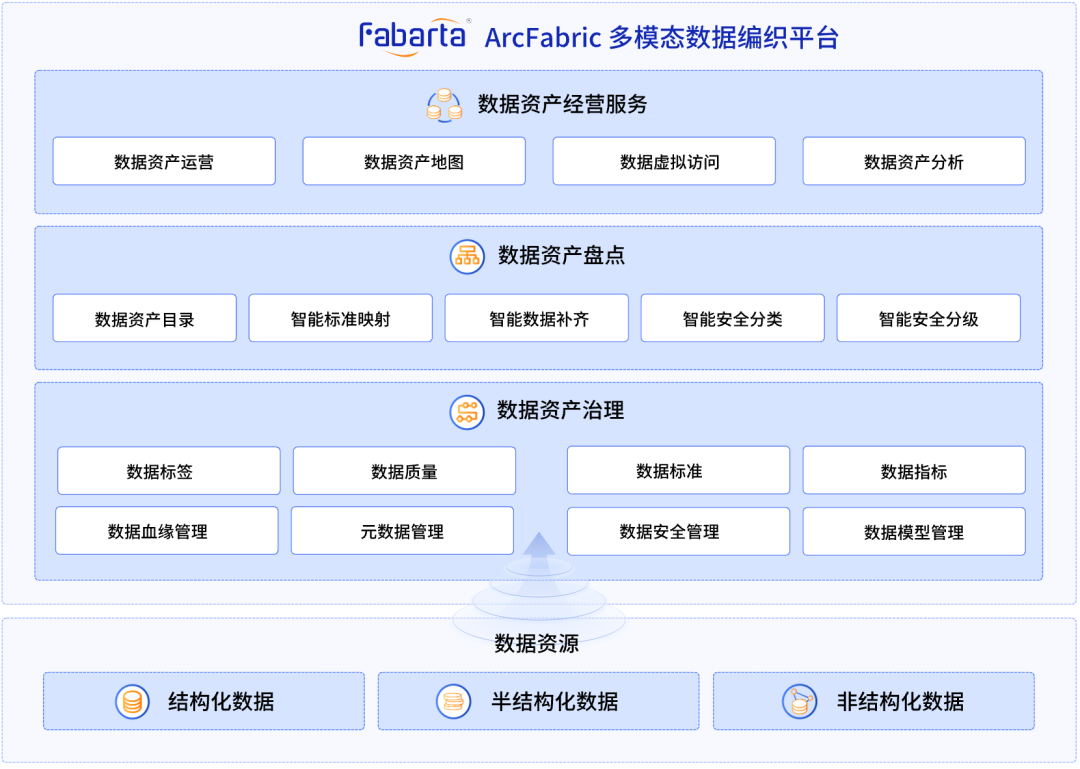 Fabarta ArcFabric 多模态数据编织平台架构图Fabarta ArcFabric 多模态数据编织平台作为 Fabarta 产品矩阵中的“数据翼”,充分利用大模型能力,实现智能数据管理,对接企业已有的大数据平台,梳理和治理企业海量多模态数据,构建数据资产地图,并为 AI 大模型落地提供智能数据基础,提供 AI 落地就绪的数据(Data Reay for AI)。