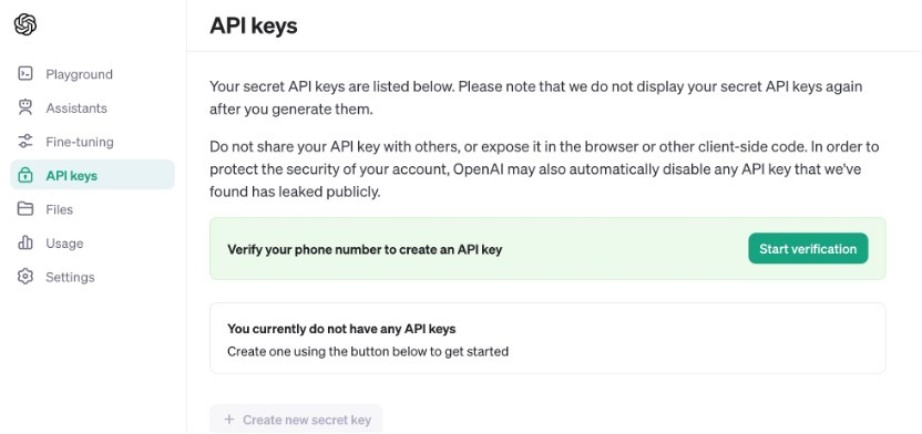 OpenAI:收费或者免费的帐号,收费的为ChatGPT 4.0,免费帐号模型为ChatGPT 3.5,申请方法访问网站: chat.openai.com,需要有一个邮箱建议使用gmail邮箱,还需要一个能正常使用openai的国家的手机号码,用来接收验证码(生成API KEY时手机号为必须项)。