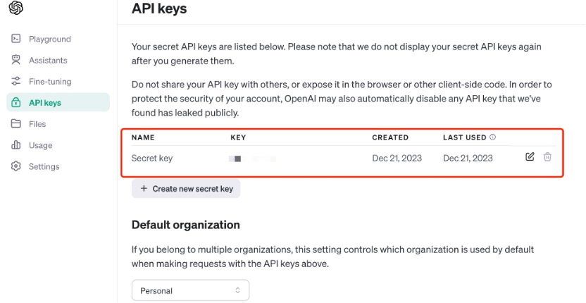 登录OpenAI帐户,打开如下链接,进入到API Keys页面: