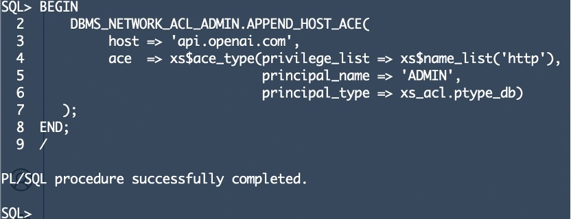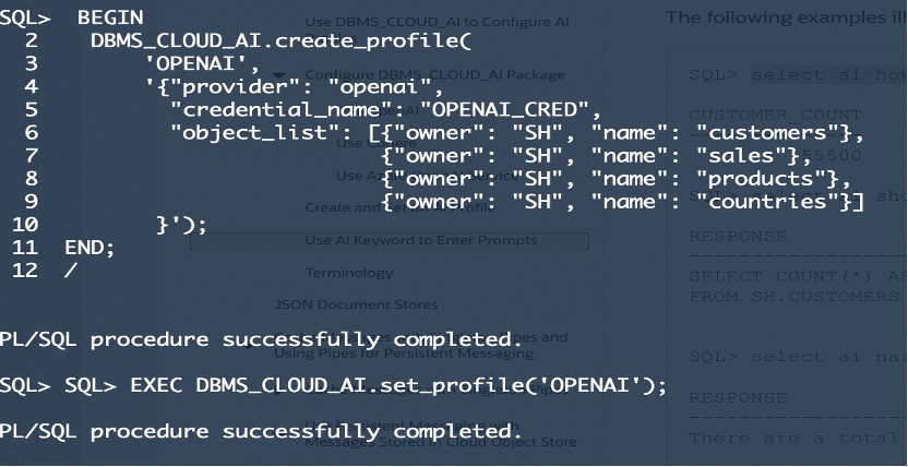 EXEC DBMS_CLOUD.CREATE_CREDENTIAL('OPENAI_CRED', 'xxxx@gmail.com', 'OpenAI API KEY');