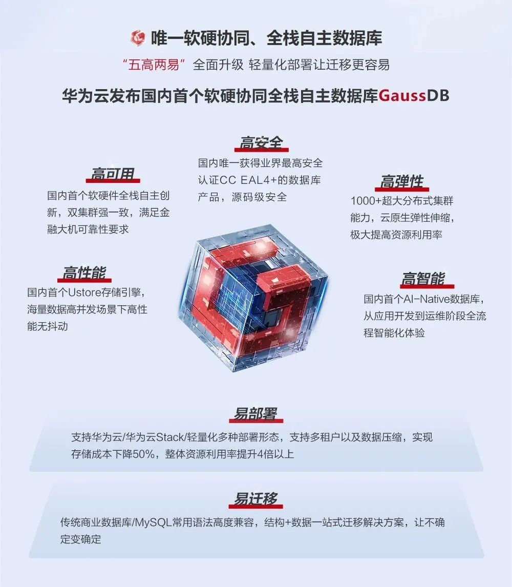 华为云GaussDB核心代码100%自主创新,具备高可用、高安全、高性能、高弹性、高智能的技术优势。在数据库替换场景中,又具备易迁移,易部署的特性。