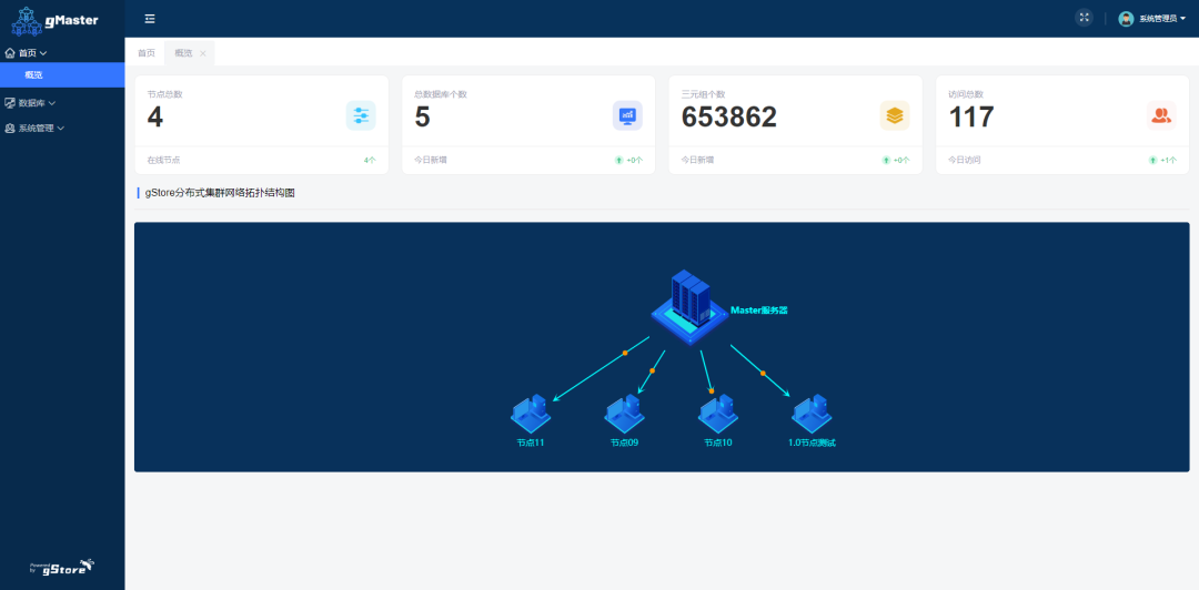 登录gMaster,点击左侧菜单【首页】下的【概览】,可以查看集群网络拓扑结构图。页面上半部分展示了节点总数、在线节点数、总数据库个数、今日新增数据库个数、三元组个数、今日新增三元组个数、访问总数、今日访问数。页面下半部分展示了gStore分布式集群网络拓扑结构图。