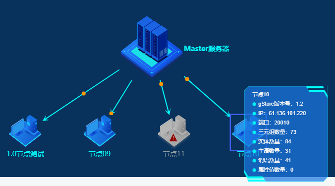鼠标悬浮到节点图标上时,方框展示该节点的gStore版本号、IP、端口、三元组数量、实体数量、主语数量、谓语数量、属性值数量。当节点链路正常时显示蓝色图标,当节点链路异常时显示灰色图标。