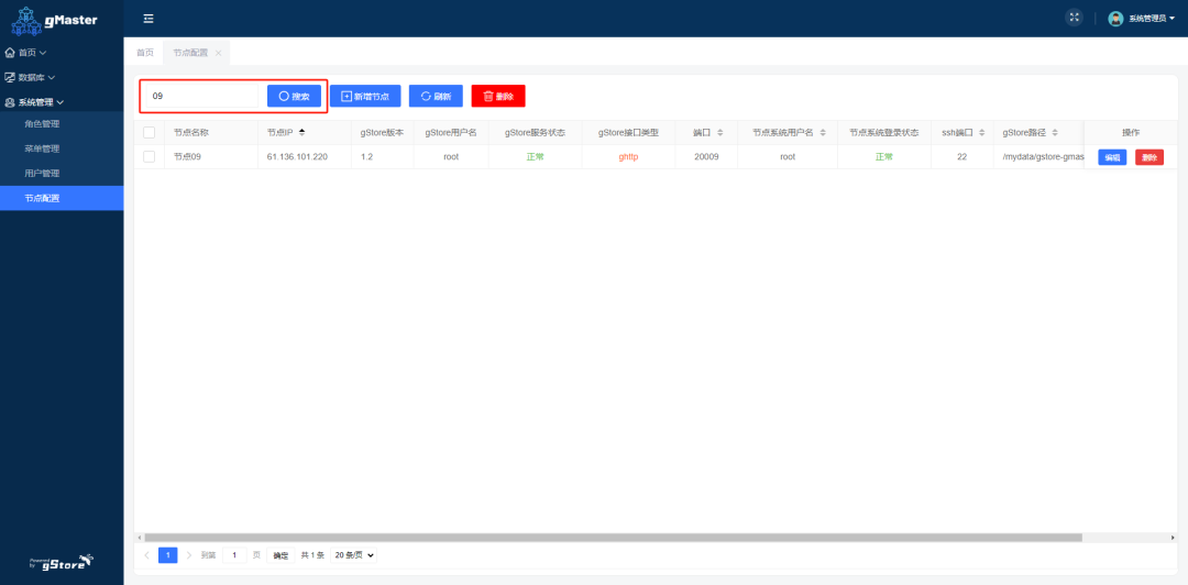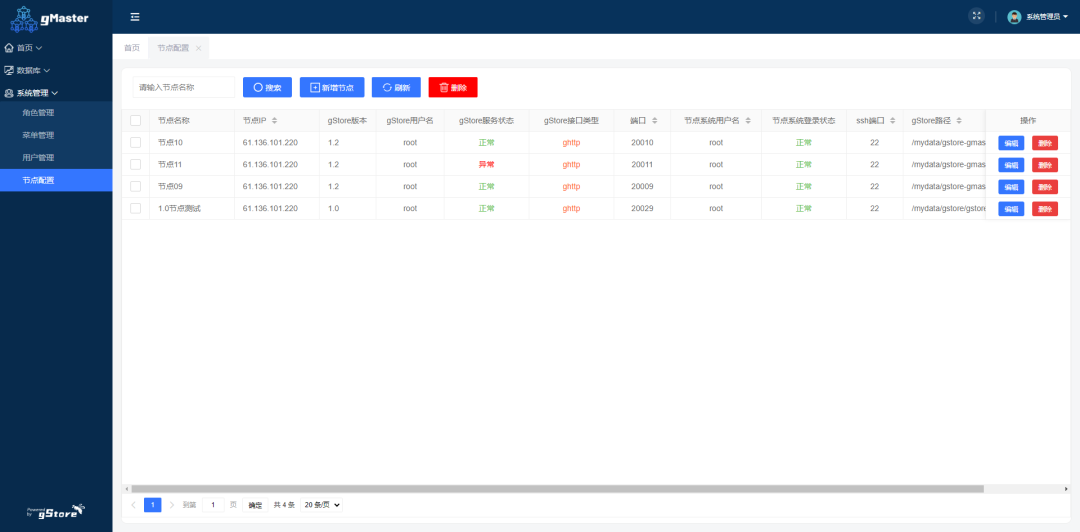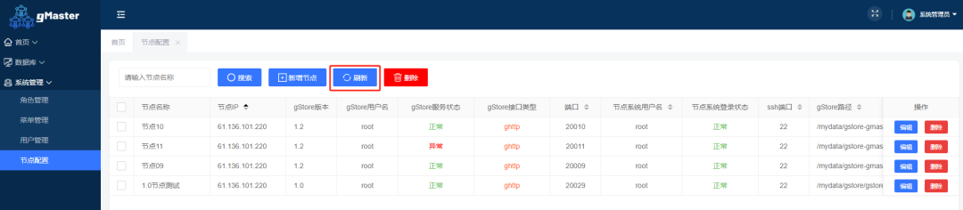 点击左侧菜单【系统管理】下的【节点配置】,可以进入节点配置页面,展示当前已配置的所有节点的节点名称、节点IP、gStore版本、gStore用户名、gStore服务状态、gStore接口类型、端口、节点系统用户名、节点系统登录状态、ssh端口、gStore路径列表。列表默认以节点创建时间升序排序,其中节点IP、端口、节点系统用户名、ssh端口、gStore路径可以点击列名以该列进行排序。