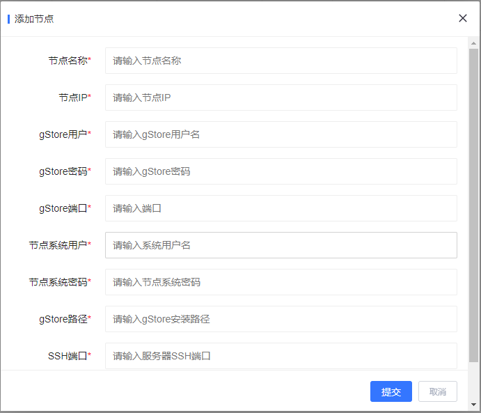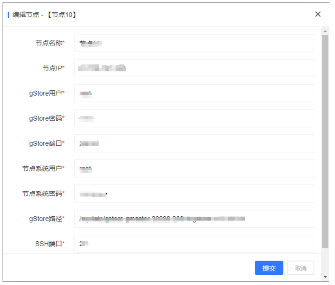在服务器上安装gStore服务后,可以在节点配置页面新增节点。点击【新增按扭】,弹出新增节点页面,需要输入节点名称、节点IP、gStore用户、gStore密码、gStore端口、节点系统用户、节点系统密码、gStore路径、SSH端口、接口类型,所有字段都是必输项。密码字段以*反显。接口类型有两种可选:ghttp和grpc。grpc 是基于开源库 workflow 实现的一个基于 HTTP 协议的高性能网络接口服务,进一步提高了接口服务的效率和稳定性。grpc 与 ghttp 的对比实验结果表明,grpc 在并发访问性能方面有巨大提升,在2000/QPS情况下,拒绝访问失败率为 0%。
