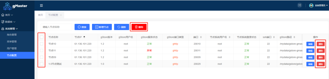 勾选节点列表左侧的选择框后,点【删除】按钮,可以对节点进行批量删除,也可以单击每条节点操作列中的【删除】按钮删除单条节点。