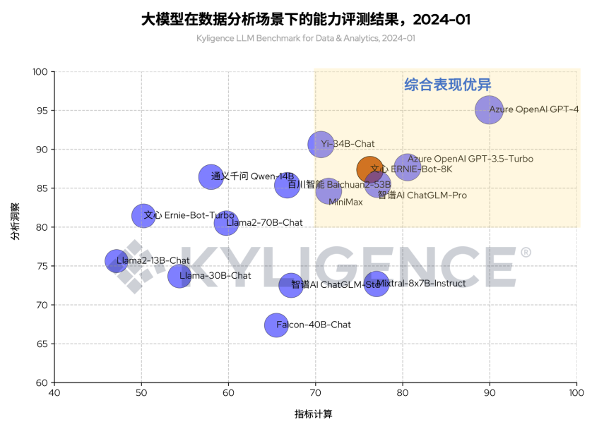 根据表 1 的评测明细数据,在本轮评测中 ERNIE-Bot-8K 综合评分位列前三,是目前评分最高的国产大模型。如图 3 所示,从指标计算和分析洞察两个角度来看,ERNIE-Bot-8K 归属于“综合表现优异”象限。这个象限表示大模型在数据分析场景满足实际落地的基本要求,国内企业在为数据分析场景选型大模型时,往往出于数据合规安全考虑需要选择国产大模型,可参考该象限的数据结果。