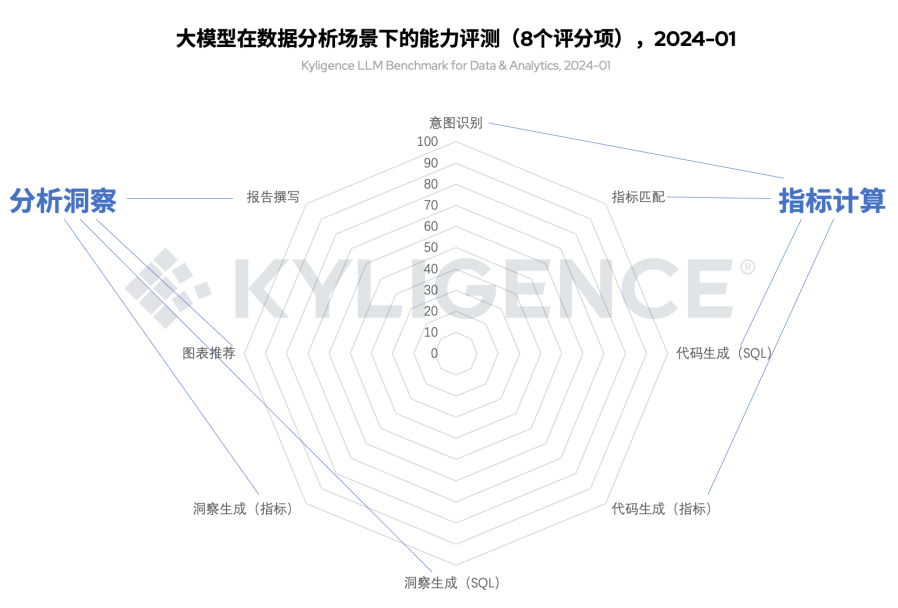 随着 AI 数智助理 Kyligence Copilot 客户落地场景越来越多,我们也持续改进《数据分析场景下的大模型能力评测框架(Kyligence LLM Benchmark for Data & Analytics)》的评分维度与数据集。在最新版本中,我们共设置意图识别、指标匹配、代码生成(SQL)、代码生成(指标)、洞察生成(SQL)、洞察生成(指标)、图表推荐、报告撰写等 8 个评测维度,并归类为指标计算、分析洞察等两个角度,以此对各个大模型进行实测评分。