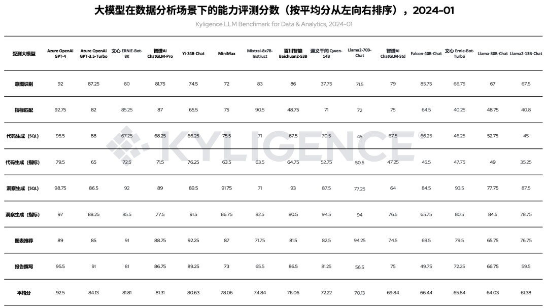 表 1 大模型在数据分析场景下的能力评测分数(按平均分从左向右排序),2024-01