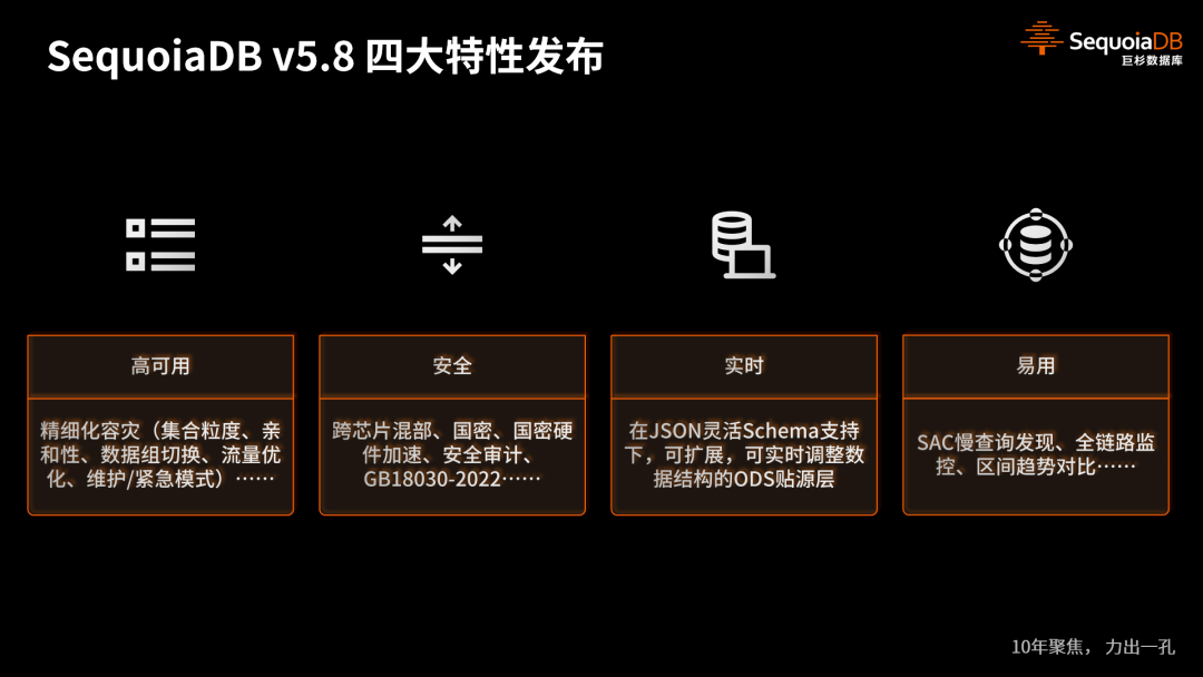 巨杉数据库基于JSON文档型底座对SequoiaDB进行了全面升级,此次发布活动全面解读了SequoiaDB的四大特性——高可用、安全、实时和易用。