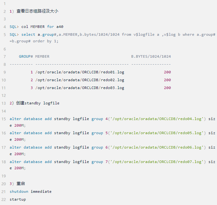 redo log 的组数参考公式: (online redo log 组数 + 1) * 数据库线程数;单机线程数为 1, RAC一般为 2。 Standby redo log 的组成员数和大小也尽量和 online redo log 一样。