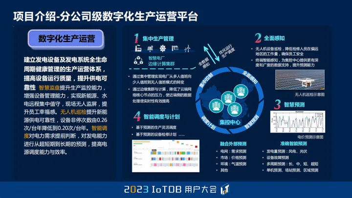 这个是在我们某个分公司,它要做一个数字化生产运营系统。大家也知道,现在很多风机、光伏都在比较偏远的地方,目前基本上都是接到分子公司来做集中的控制,这是其中一块。第二块,我们还有在光伏或者风机通过无人机进行巡检,巡检的数据在边缘处理以后,也要汇聚到分子公司或者集团。第三就是通过这些汇聚的数据,我们要做一些设备的诊断或者预测,再针对所有的这些数据做智能调度,我刚刚讲到了,这一块很重要,跟现货交易也息息相关。