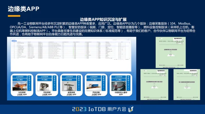 基于这整个物联网的框架,我们也会有一些终端以及边缘类的 App 的积累。目前我们大概是分了几个板块,包括边缘采集板块,这里面我刚刚讲了一下,主要是包括 IEC 104、Modbus、西门子等等这些协议类型。还有一种就是智能安防类型的,智能安防类型目前主要是针对视频、门禁、定位、语音播报类的。还有燃料类型的,就是采样机、衡器等等这些类型。整个 App 的应用是可扩展性的。