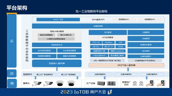 那么基于我们整个的工业物联网平台,这是我们整体的架构图。我们可以看到它也是分为云、边、物这几端,在最上面可以看到,我们主要是通过标准的 MQTT 协议,对外提供信息交互,也对外提供标准的 API 的交互和视频服务的交互,以及我们的物模型也会进行一些交互,进行物模型的管理。考虑到这个过程当中,因为我们现在也有很多分析型的或智能化的应用,分别会上升到分公司或者集团,所以会把一些 App 和智能化的应用放到分公司,并让分公司或者集团能够下发到边缘的厂侧,使其采集侧能够进行一些智能、智慧化的应用。