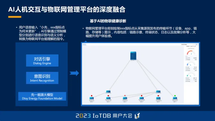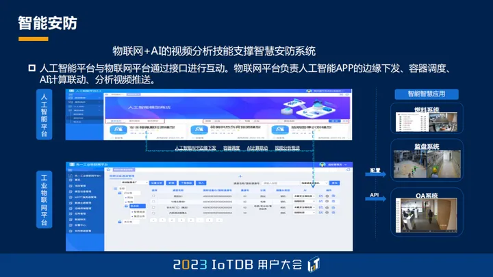第四个部分就是关于大唐物联网平台未来的展望。这一块其实今天上午也听了一下王老师、乔老师,还有其他老师的一些汇报,我们也在想这些内容,因为我们的物联网平台从采集到存储都已经有了,那么我们现在也在考虑 AI。目前我们的 AI 和物联网平台是要做一个设计的转换,如果未来 IoTDB 本身内置有机器学习算法或者推理平台,对于我们来说,我们的技术架构可能会更加简洁,可靠性也会更高。因为我们现在做的话,可能是需要把数据转到另外的数据库、大数据平台做一些分析,是这么一个过程,还是更繁琐的。包括上午龙(明盛)教授讲的,关于建立整个时序的、基于设备的大模型,我觉得这个非常好,我们未来也可以与 AI 这方面结合起来,我们也愿意做第一个吃螃蟹的。