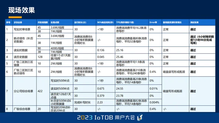 最后,表中的第七个就是分公司的综合场景的应用。分公司综合场景刚刚提到,不光是在写实时数据,同时还要读实时、读历史、补历史数据等等,因为这里面有的可能是给 AI 服务中台提供服务,有的是给企业的用户消费提供服务。目前整个这一块在写、读实时数据 500 万点条件下,也是在秒级以内能够满足要求,厂级数据大概也是在秒级左右。可能某些地方还有一些错误,我们自己还在调试。在大量历史数据同步的过程当中,因为我们的数据量非常大,也会对每个数据做校验,就发现有些数据还是有些问题。这个我们自己也在找原因,后续也会给清华这边分析一下,可能也要帮我们分析一下到底是哪方面原因。