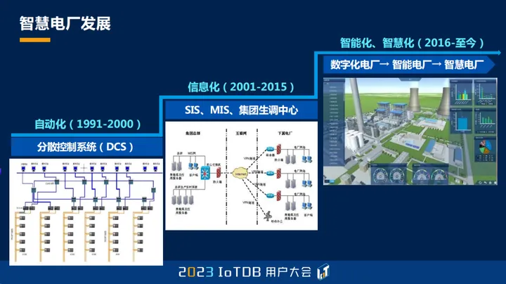 为什么要讲智慧电厂呢?因为我们公司成立于 2004 年,这二十几年我们的主营重点是在能源行业,而且能源行业里面重点在发电这一块,所以我们在发电行业里面耕耘了二十几年,对智慧电厂这一块还是有非常多的积累。从最早的 90 年代的自动化,到 2000 年的信息化,以及到现在的智能、智慧化,目前也有很多的企业在做智慧电厂。可能有的企业是做数据行业的,认为数据治理就是信息化的、智慧化的电厂所要具备的;有些做三维的、虚拟化的企业,就认为他是做智慧电厂的,但是对于这一块,我们先一公司有自己的一些见解。