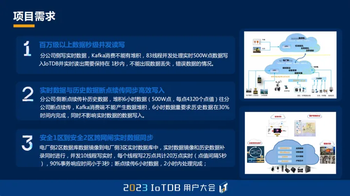 那有一些什么样的挑战呢?第一,在所有的电厂这一侧,要写到分公司的这一侧,我刚刚讲了,数据是要直接写到 Kafka 进行消费,且在 Kafka 的消费过程中,不能够有数据堆积的情况。所有的电厂我们已经做了一个统计,每秒钟大概有 500 万点数据要实时地写入到 IoTDB,也就是写入到我们的 Kafka 队列,在我们上层的 Kafka 队列的消费者要直接消费到 IoTDB 里面去。在消费的同时,因为还有很多 AI 平台的数据,要从 IoTDB 的数据库里取数,也就是说不光是要不停地写数据,而且要不停地读数据,因为要支持分析需求。整个过程都要能够在秒级进行处理,不能够出现数据丢失或者是错误的数据。我们未来在厂级基本上就会很少再部署这个监控系统,都会在集团侧,或者分公司这一侧来进行部署,所以对这个数据的实时性要求是非常高的。