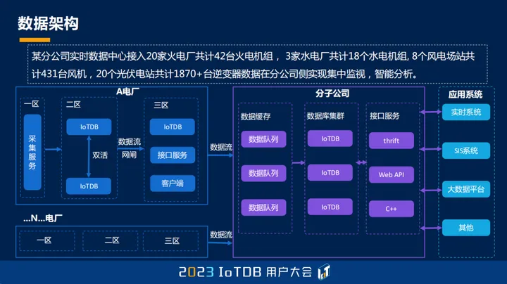 我把其中的一个数据流程架构给大家分享一下。目前分公司的实时数据中心是基于 IoTDB 1.2 版本来进行搭建的,当前接入的大概有 20 多家火电厂,共计有 42 台火电机组,每台火电机组接入的点数大概是 2 万点;还有 3 家水电,共计 18 台水电机组;还有 8 个风场,共计 400 多台风机的数据接入;以及 20 多个光伏电站,有 1800 多台逆变器的数据,都需要在这个分支公司进行监视,并且要做到智能分析,也就是我讲的,要把这个数据汇聚到我们的分支公司,实现刚才上面的四种应用。