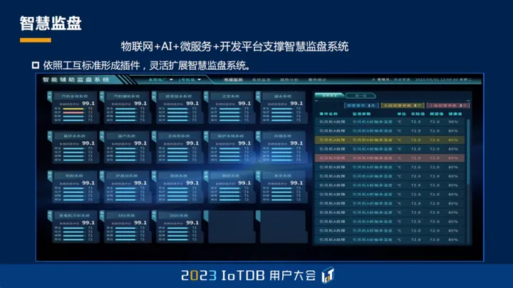 这个是我们基于物联网平台、AI、以及微服务,开发的一个智慧监盘的系统。其实我们也知道,现在有很多公司在汽车领域推自动驾驶,是吧?还有一些辅助驾驶功能。那么在电厂,我们在监盘这一块对所有的系统、设备,总公司搭建了一共有 96 个,差不多 100 个模型,通过这些模型从系统,到整个机组,再到整个电厂,能对它的健康状态进行分析,能指导我们的运行人员和值班人员很好地进行监视、监控。