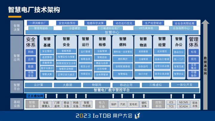 这个是我们公司智慧电厂的一个技术架构图。在基础设施这一块,因为我们涉及的最底层是基础设施,主要是一些智能设备和电力设备。通过泛在感知网到上面这一层,包括云计算、大数据和物联网组成的数字化管控平台。智慧化应用部分我们大概是分为几个,从电厂初期的基建,到它的安全、运行、检修,以及燃料、物资,和经营、办公,覆盖整个电厂的全方面、全过程。最上面是做智慧决策的架构。