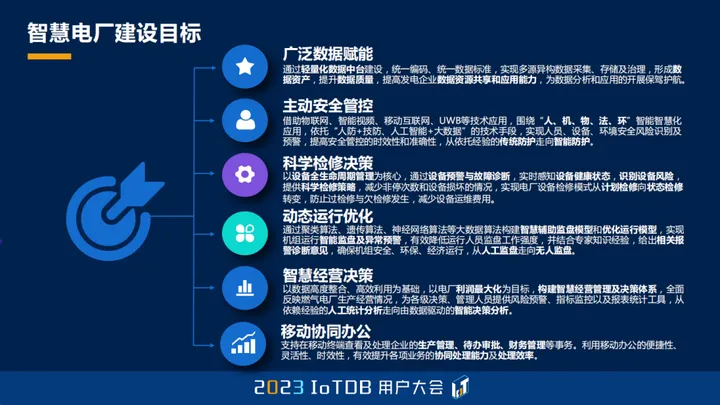 智慧电厂这一块,我们主要是有几个目标。第一就是关于数据赋能,主要是要有一个统一的数据指标,首先就要包括数据感知和采集上来,这部分我们重点是会用时序数据库,目前主要是跟 IoTDB 结合比较紧密。第二就是安全方面,包括电厂的一些智能视频的应用、UWB 定位技术的应用,包括人工智能,人防+技防的一些应用。另外,因为在电厂里面主要有运行、燃料和设备,设备现在可能会向状态检修进行转变。包括运行优化,我刚刚讲了。还有智能、智慧的决策,决策的话主要目标还是走向数据驱动。
