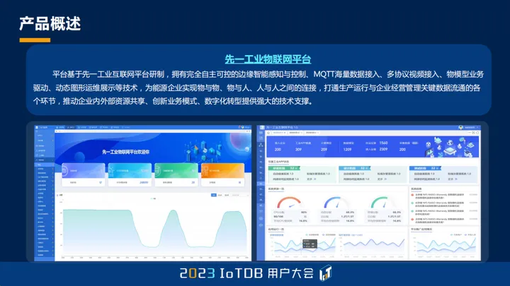 其实我们先一公司也有自己的物联网平台,我们的物联网平台主要是基于我们的工业互联网平台研制的。目前我们主要是解决几个问题,一个是数据采集的问题,也就是数据接入的问题,就是可以支持多种数据协议的接入,比如说 IEC 103、IEC 104、ModBus 等等协议的接入。采集问题解决以后,就是存储问题,存储的话主要是边缘端的存储,以及我们在云端的存储,这一块主要利用我们的时序数据库来实现。再有就是数据的分析以及展示的功能。
