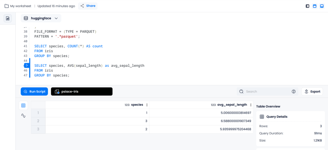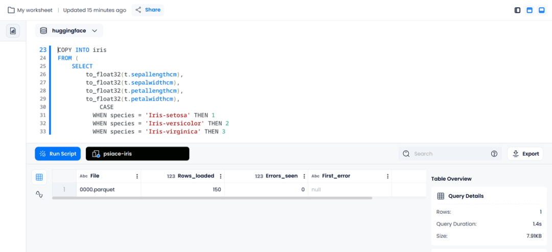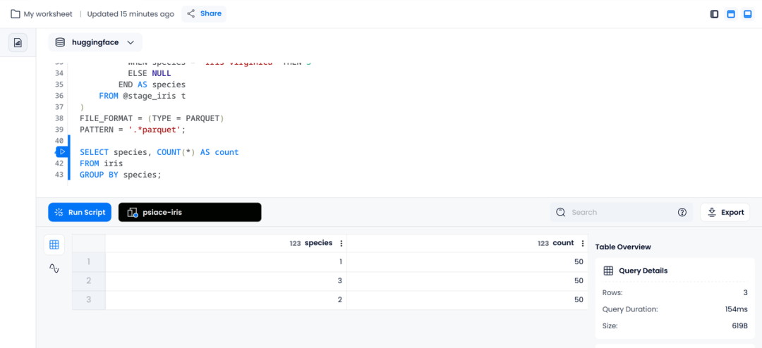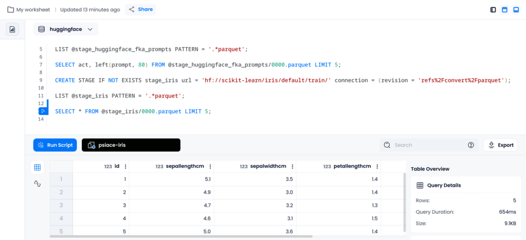 CREATE STAGE IF NOT EXISTS stage_iris url = 'hf://scikit-learn/iris/default/train/' connection = (revision = 'refs%2Fconvert%2Fparquet');