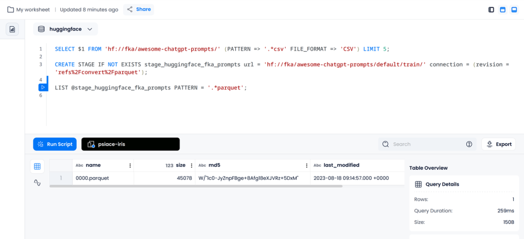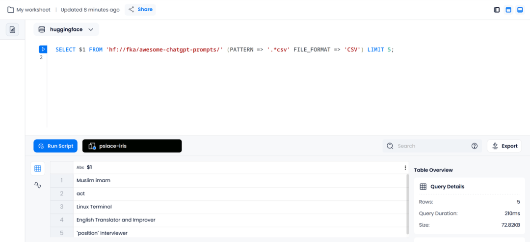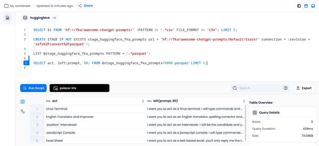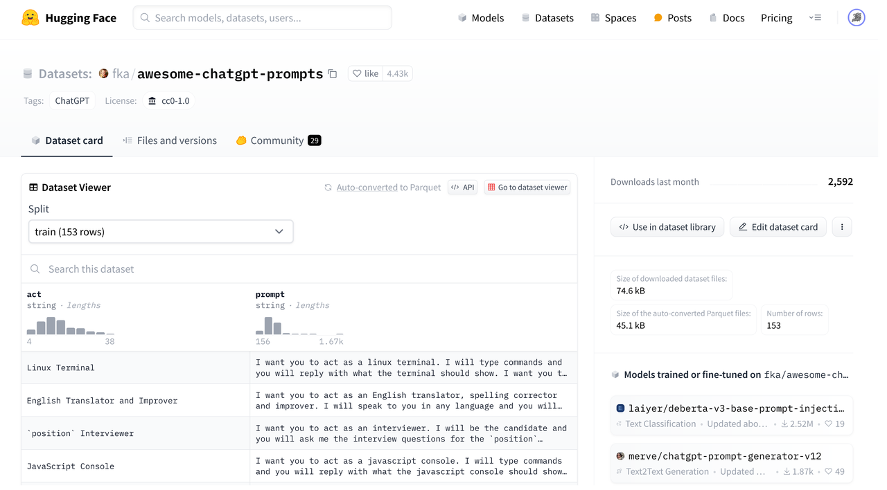 Databend 提供多种与 HuggingFace 集成的方式,在接下来的部分,我们将会以 fka/awesome-chatgpt-prompts 作为例子,说明如何使用 Databend 访问 HuggingFace 数据集。
