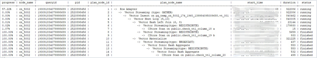 不断刷新视图,能看到语句执行情况,观察进度介于(0,100)之间的进度算子,这些代表该算子正在运行。