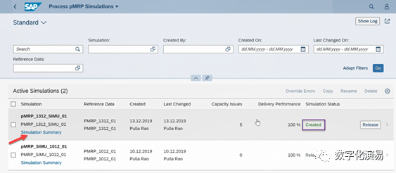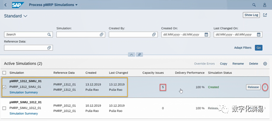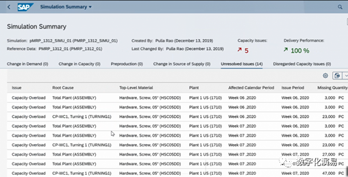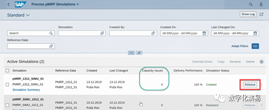 接下来,我们以“调整可用能力(Change Available Capacity)”的方式来处理并消除与W8有关的能力Issue。在图17所示的需求计划模拟页面中,能力Issue只剩下1个,而W8列的需求数据格仍然有红色警示框做提醒。我们点击屏幕右下方的蓝色字体Capacity Plan Simulation,进入到Capacity PlanSimulation页面,具体参见图18:图18:Capacity Plan Simulation页在图18所示屏幕的黑色框框处,点击Change Available Capacity按钮,进入到图19所示的Change Available Capacity处理页。选择或输入需要调整可用能力的所在周,也就是W8,然后点击屏幕右下方的Apply按钮,让可用能力调整生效。图19:Change Available Capacity处理页返回到Demand PlanSimulation(需求计划模拟)页,我们会发现,与能力有关的所有Issue都已清零,详情可参见图20:图20:能力Issue全部清零的Demand Plan Simulation页至此,pMRP模拟运行的结果处理已全部完成。如果想让处理后的模拟结果传递到常规运营环境中,可以将该结果进行发布。为了发布模拟结果,我们需要返回到pMRP模拟处理的首页,找到需要发布的任务行,点击该任务行最右边的Release(发布)按钮,就可以将模拟结果发布并传送到常规运营环境,而该pMRP模拟运行任务的状态也更新为Released(已发布),详情参见下图21:对于产成品物料而言,pMRP模拟运行结果将在常规运营环境中以版本01(非激活)的形式存在,要想将之用于指导实际的生产计划,还需将该版本的数据转为版本00(激活)。作为一种生产计划工具,pMRP是SAP S/4HANA计划工具包中的有益补充。正如本文文首所述,在应用效果上,pMRP要优于LTP;在系统操作上,pMRP比LTP、PP/DS等都要简单得多,不需要做任何的系统配置,通过Fiori Apps的操作导航就可以完成全部操作。由此可见,pMRP是一种简单、易用、有效的计划工具,值得大家学习和尝试。当然,和其他计划工具一样,pMRP的有效应用,离不开制造基础数据的质量,尤其是工作中心和工艺路线中工时定额数据(在SAP系统中以标准值和计算公式等形式来体现)的准确。如果这些基础数据的质量不能保证,再简单易用的计划工具也发挥不出其应有的效果。【参考资料】本文所用到的系统屏幕拷屏,全部来自网页:https://www.sapspot.com/pmrp-predictive-material-and-resource-planning-in-sap-s-4hana-step-by-step-execution/
