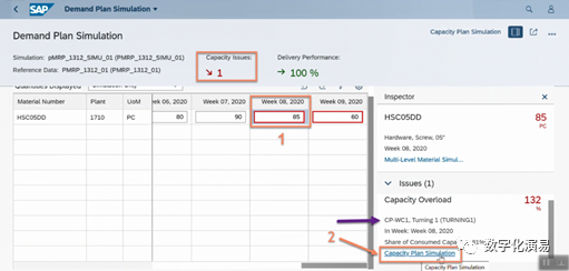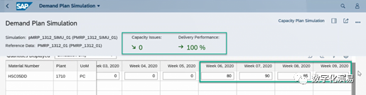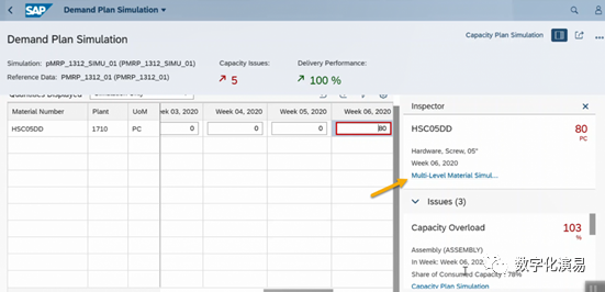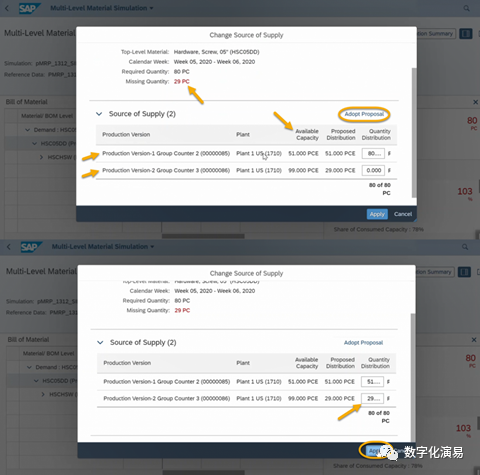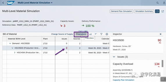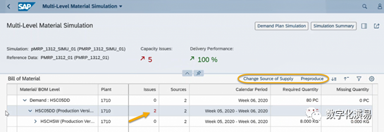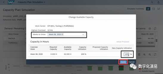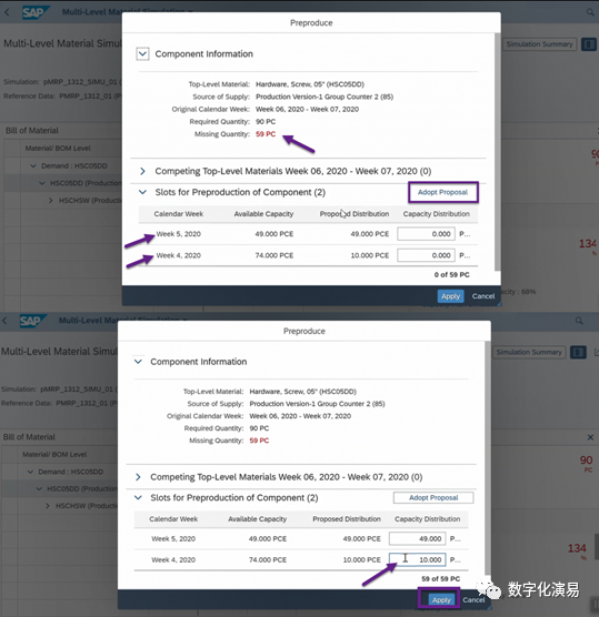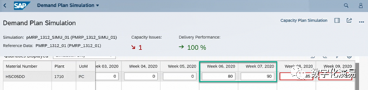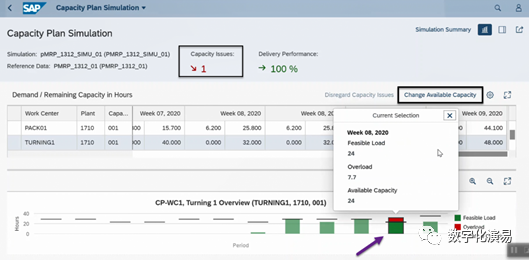 接下来,我们以“提前生产(Preproduce)”的方式来处理并消除与W7有关的能力Issue。在图13所示屏幕右方,点击蓝色字体Multi-Level Material Simulation,进入到图14所示的Multi-Level Material Simulation页面。图14:Multi-Level Material Simulation页在图14所示的屏幕中,选择存在能力Issue的行(紫色箭头所指),再点击其右上方的Preproduce按钮,进入到Preproduce处理页,详细参见下图15:在图15的Preproduce处理页中,系统首先给出了W5和W4存在富余能力的提示和建议,点击建议行右上方的Adopt Proposal按钮以采纳系统的建议,然后在点击屏幕右下方的Appy按钮,让建议结果生效。返回到需求计划模拟页面,系统显示,与能力有关的Issue数量减少到1个,而原本需求计划表中W7列需求数据格外围的红色警示框也消失了,详细参见图16:c. 调整可用能力
