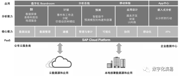 在业务分析的工具提供上,SAP公司的发展策略的是逐步云化,把各种业务分析工具和能力向SAP分析云上迁移。具体来说,在解决方案的提供上,预测性分析、规则性分析等先进分析能力以后将只能在SAP分析云上获得。实际上,以SAP Leonardo为品牌的机器学习、物联网等技术就是封装在SAP Cloud Platform的服务目录中供业务分析来调用。