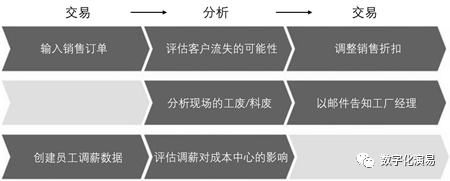 如图1所示,上述三个业务流程都涉及到交易处理和数据分析,而流程作业的理想状态应该是将交易处理和数据分析融合在一起,在业务处理中需要了解的相关背景信息或可能的业务影响应该能即时获取,或者对业务做数据分析且发现变动或异常时,能将变动或异常情况立即告知相关责任人进行跟进。因此,在企业的数字化建设中,为了确保各项业务的高效执行,将OLTP和OLAP进行有机的整合是十分必要的,而S/4HANA嵌入式分析的主要价值也就在此。
