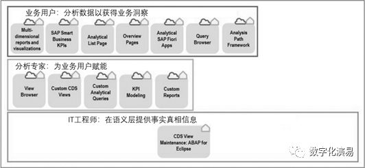 S/4HANA嵌入式分析假定为企业中的三类用户提供数据分析服务:业务用户、分析专家和IT工程师,类似于ERP实施项目的业务用户、功能模块顾问和开发顾问。