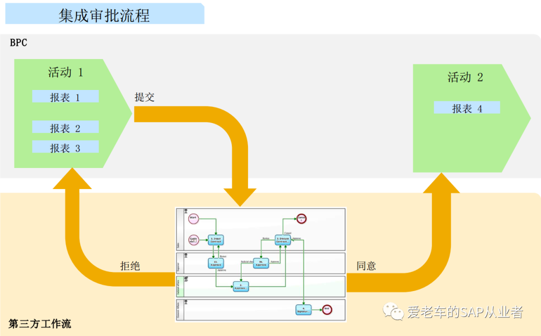 众所周知BPC的流程标准只支持一级审批功能,像中国特色的会签、转办等流程就更别想在BPC中流转了。遇到这种需求,一概的答复就是SAP不支持复杂的审批流程。我曾经在10.0版本的项目中遇到过这种需求,是通过在表单中使用VBA增加"提交"按钮,然后触发webservice和第三方OA集成实现的。