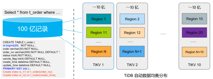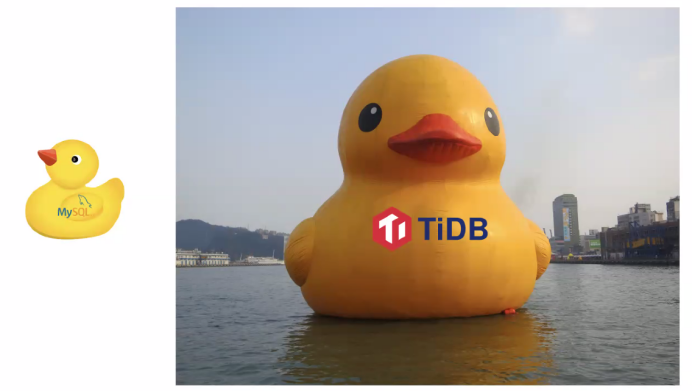 如果把 MySQL 比作一个小黄鸭的话, TiDB 就像上图中的大黄鸭(此图来自 PingCAP 创始人黄东旭关于 TiDB 的分享)。打这个比方,是为了说明 TiDB 相比于很多其它分布式数据库而言的一个优势就是对应用非常的透明。大家知道,数据库向分布式转型起初主要来自互联网厂商比如阿里腾讯,因为业务量和数据量的爆发式增长他们不得不采用一些分库分表的方案。开始阶段以中间件的方案来实现分库分表能力,后来则通过增加分布式事务与全局授时等能力后索性整合成一个分布式数据库的产品,比如 TDSQL 、 GoldenDB 。分库分表架构的数据库一个比较大的不足是需要数据库开发人员对业务非常熟悉,以便于在创建数据模型时规划合理的分片键( sharding key )。当查询条件基于分片键过滤时,便可以直接路由到对应的分片数据库实现本地化查询,从而避免跨多库的查询访问。然而, 用 TiDB 不需要考虑分片键设计的问题,这主要有两个原因:( 1 ) TiDB 的存储引擎是基于 Raft 协议实现并以 Region 为单位的分布式多副本存储,而不是采用多个单机数据库的分库分表方式;( 2 ) TiDB 中的 PD 模块具有负载均衡和自动调度能力,它可以基于节点的存储容量、负载情况来自动拆分或合并 Region ,保证了节点间的负载均衡,而如果在分库分表架构里面分片键设计不合理很有可能导致负载严重倾斜。