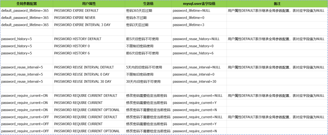 password_history:历史密码可重用的循环,表示记录历史上前多少次密码不允许被重复使用,历史密码信息记录在 mysql.password_history