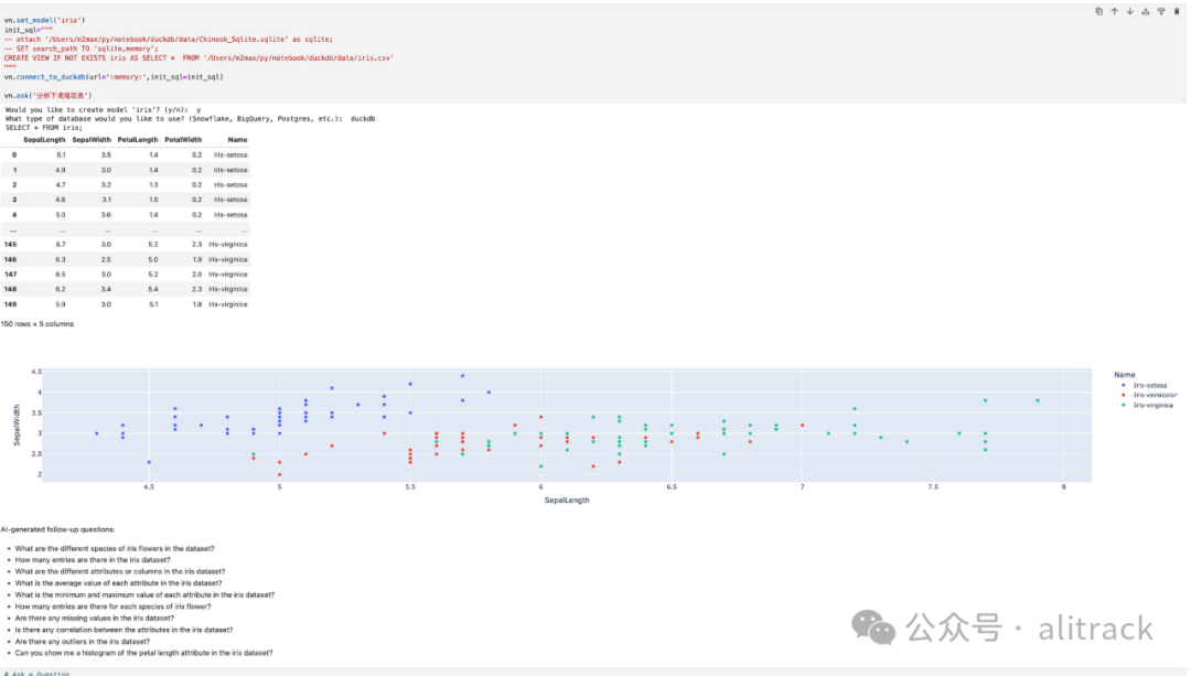 开源 支持多种 LLMs 自学习,你可以持续训练你的模型 准确度高 支持多种数据库 默认支持 SQLite,Postgres,BigQuery 和 Snowflake 可以方便扩展数据库支持,比如我就轻松实现了 DuckDB 的支持 支持多种前端 Jupyter Notebook[2] Slackbot[3] web app[4] Streamlit app[5]
