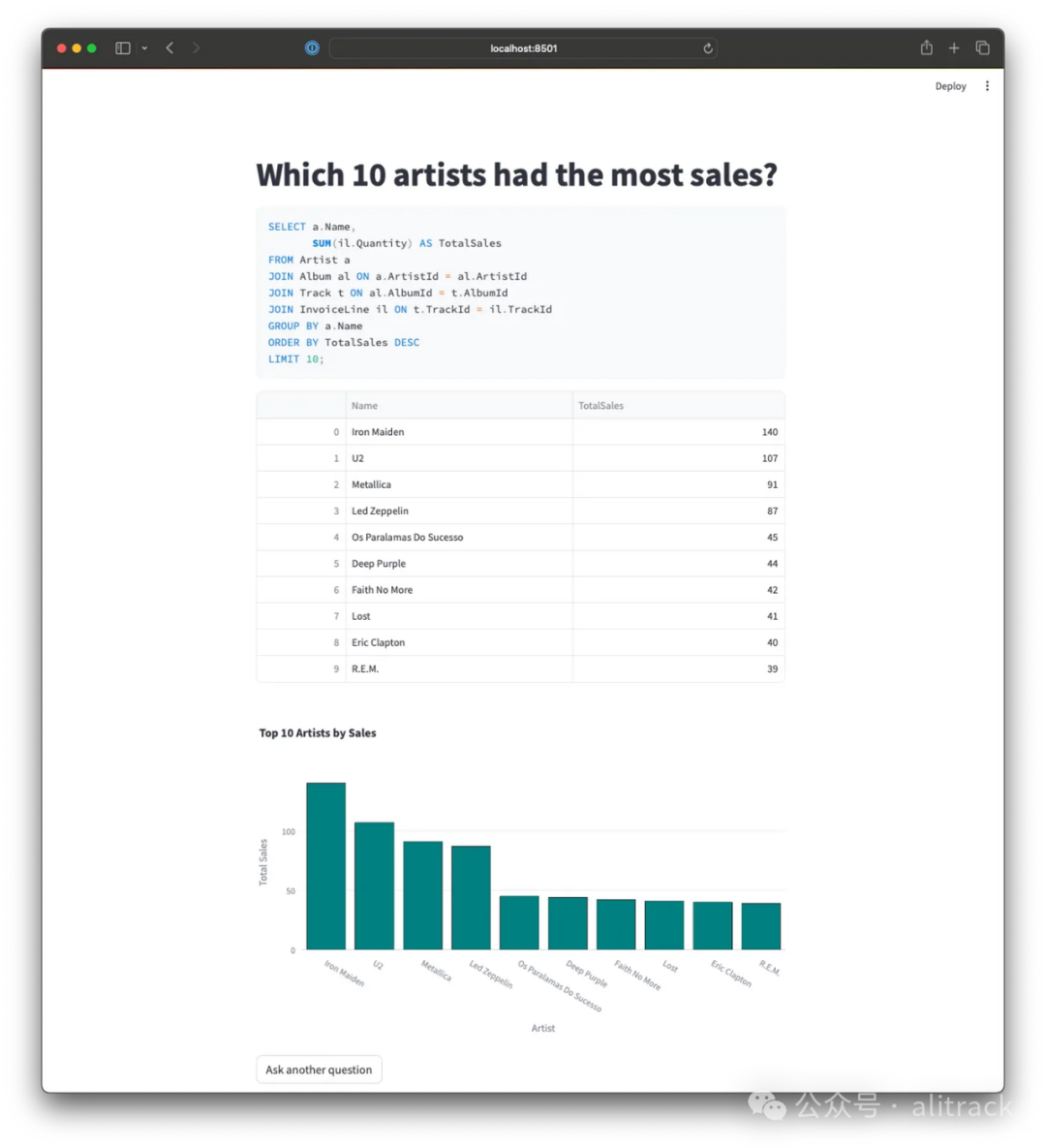 首先,让我们看一下最终产品。假设有一个包含有关记录销售信息的样本 SQLite 数据库,允许以自然语言提出任何问题,然后程序: