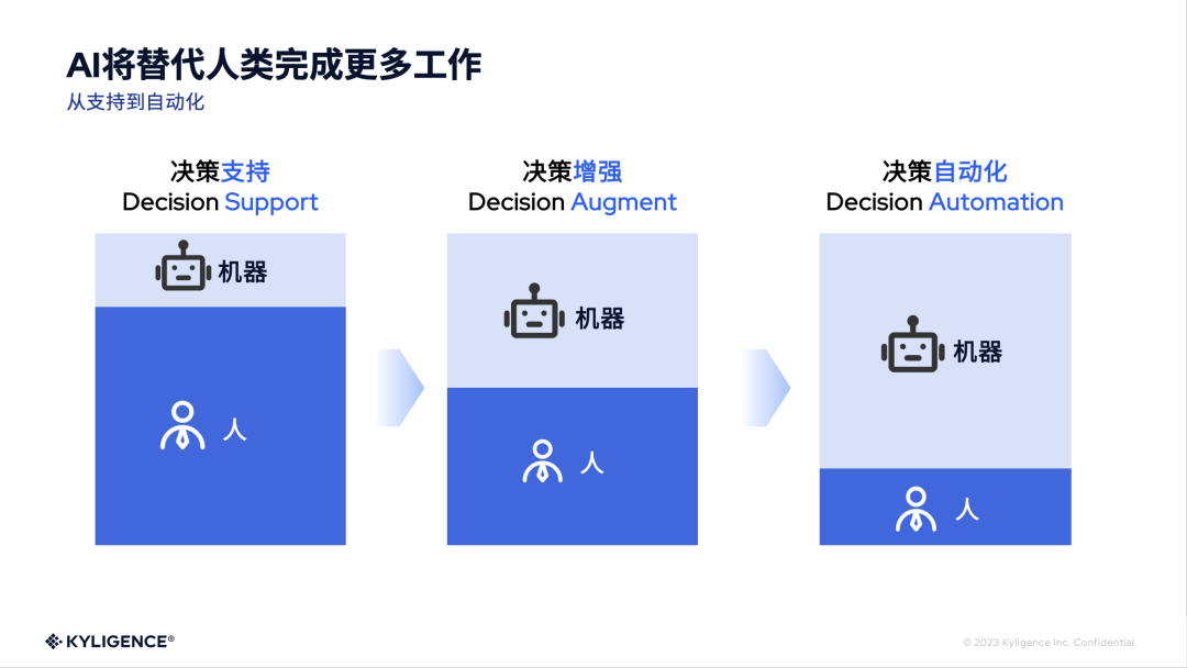AI 能带来的,将远比这些更多,我们在实践中实现了几个方向,已经产生了巨大的变化和影响,AI 将带来数据和分析的深层次革命。机器将代替人类完成更多的工作,尤其是重复的、可被自动化的。过去数据系统完成数据的加工和指标的统计后,后续需要大量的人工去分析影响相关指标变化的影响要素,探索根因,并根据经验提供相关的决策建议。