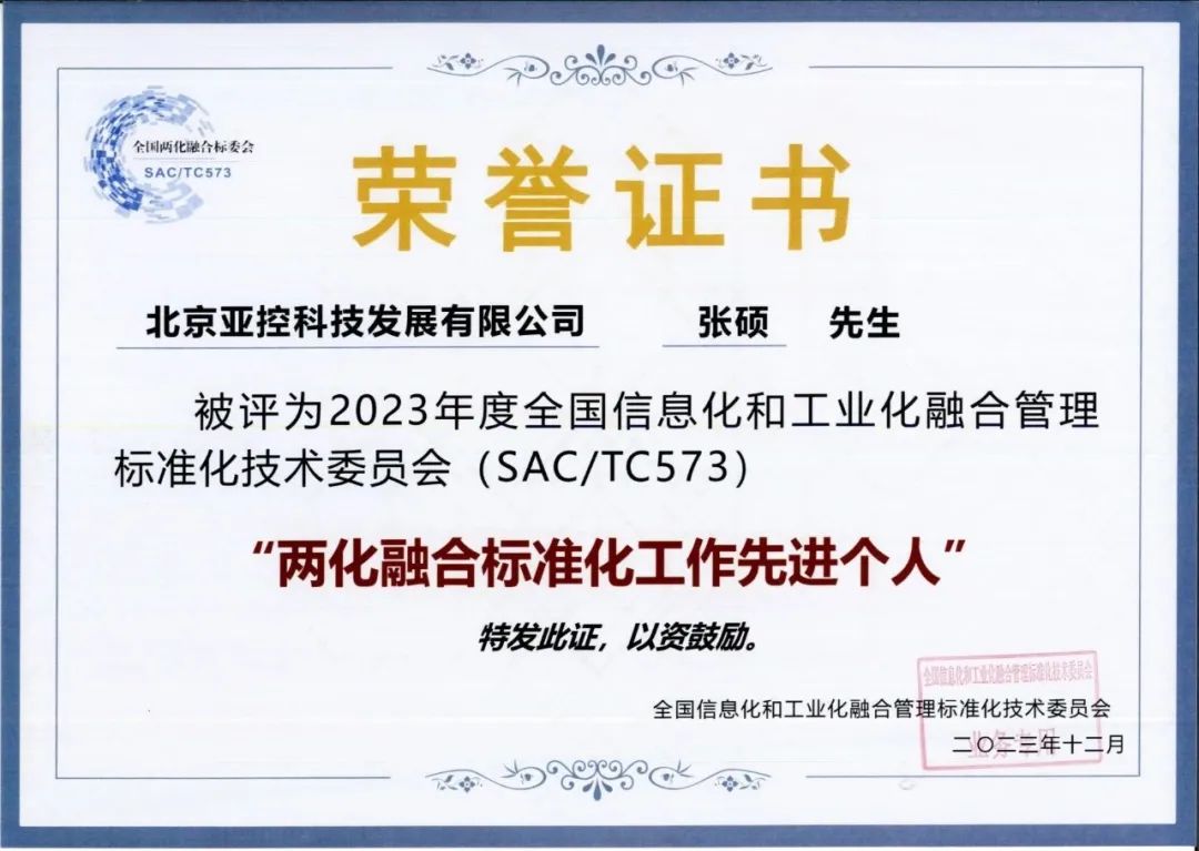 张硕先生作为亚控产品总监曾主导和参与多款核心产品设计和开发,在两化融合标准化工作中发挥了重要作用。他凭借丰富的行业经验和卓越的技术能力,为亚控在两化融合标准化工作方面取得了一系列突出成绩。此次荣获“2023年度两化融合标准化工作先进个人”称号,这一荣誉不仅是对张硕个人能力的认可,更是对亚控在推动数字化转型方面的肯定。