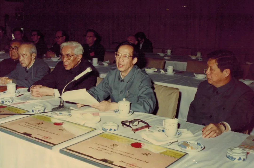 1985年,王选(右二)在新华社鉴定会上做报告,周培源(右三)坐在王选旁边