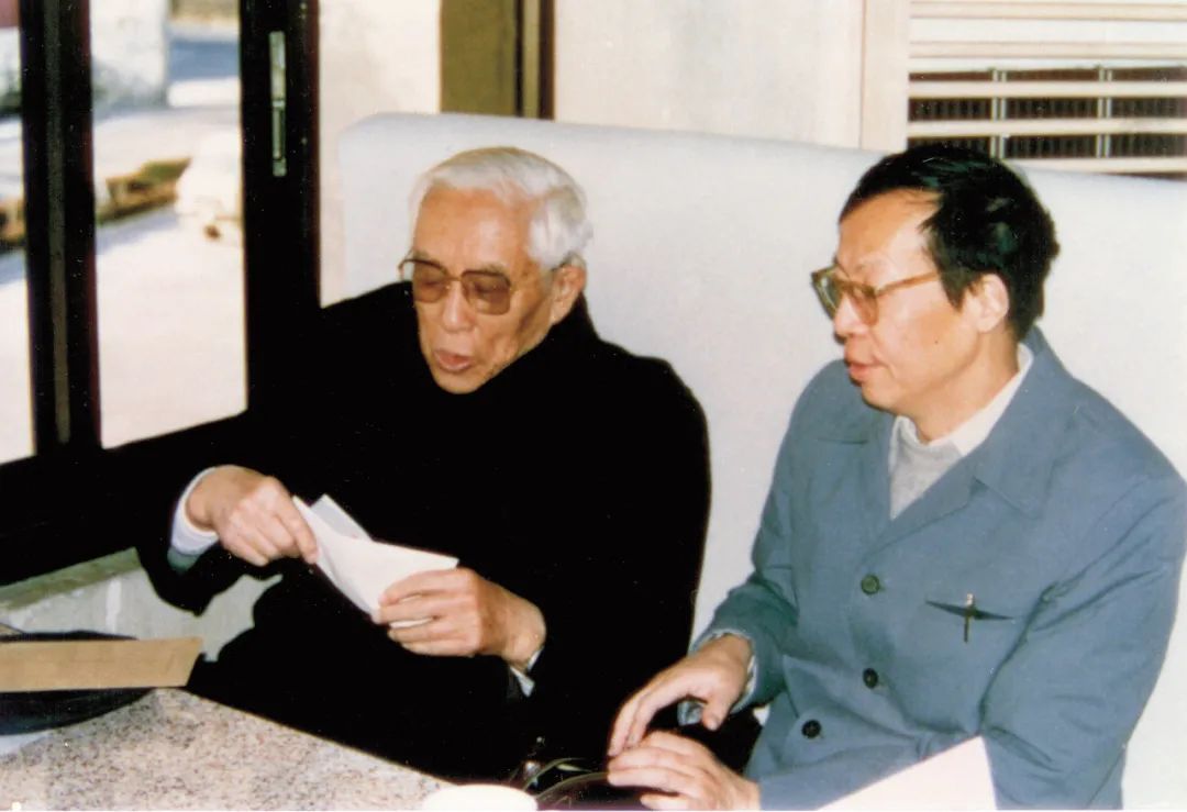 1988 年,北大新技术公司开始生产、销售华光系统。图为王选(右)与周培源(左)在新技术公司于未名山庄举办的激光照排系统推介会上