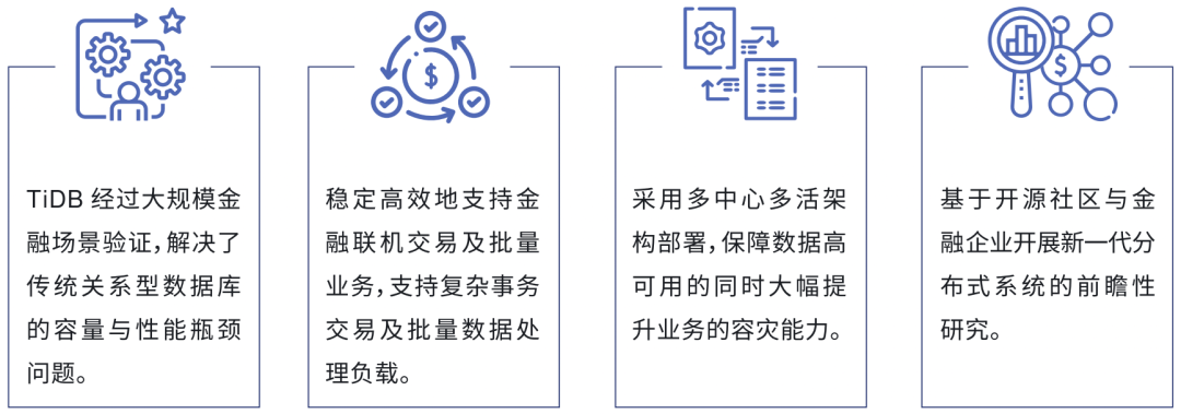 自诞生以来,TiDB 的原生分布式架构在强一致性、高可用性和可扩展性等方面与金融级业务需求高度契合,早期版本即为包括北京银行在内的金融用户提供服务。TiDB 的核心能力始终源自与中国金融用户的共同创造。作为金融级分布式数据库,TiDB 在国有大行 PB 级别的数据服务平台、头部城商行的核心交易系统、头部保险公司的核心保单系统、头部证券公司的核心交易系统,成功完成了对经典数据库和 MySQL 数据库的替换。这一系列成功案例验证了 TiDB 的关键能力,并积累了丰富的迁移和运维经验。